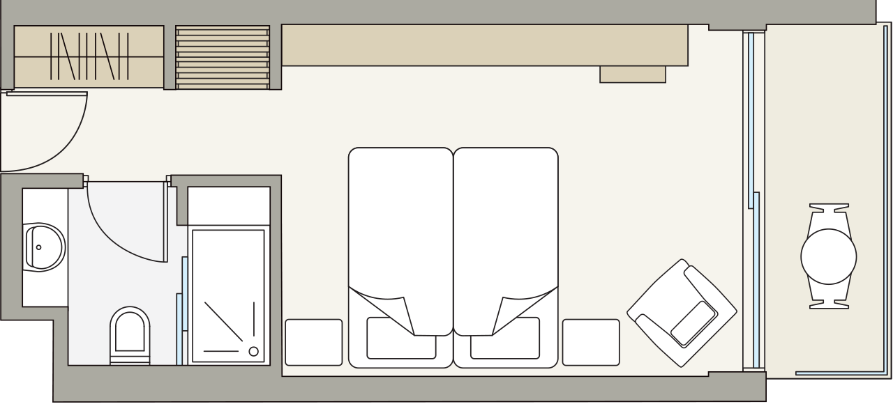• Double or twin beds with Gold Selection mattress and premium branded pillows (‘Coco mat’) and bed linen